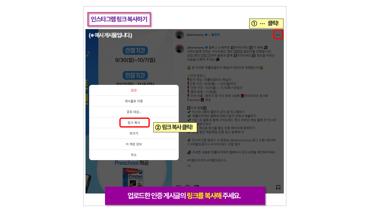 * 인스타그램 업로드 시 퍼플잉글리시 계정 (@purpleenglish24) 태그 소환 / 필수 해시태그 포함 필수
