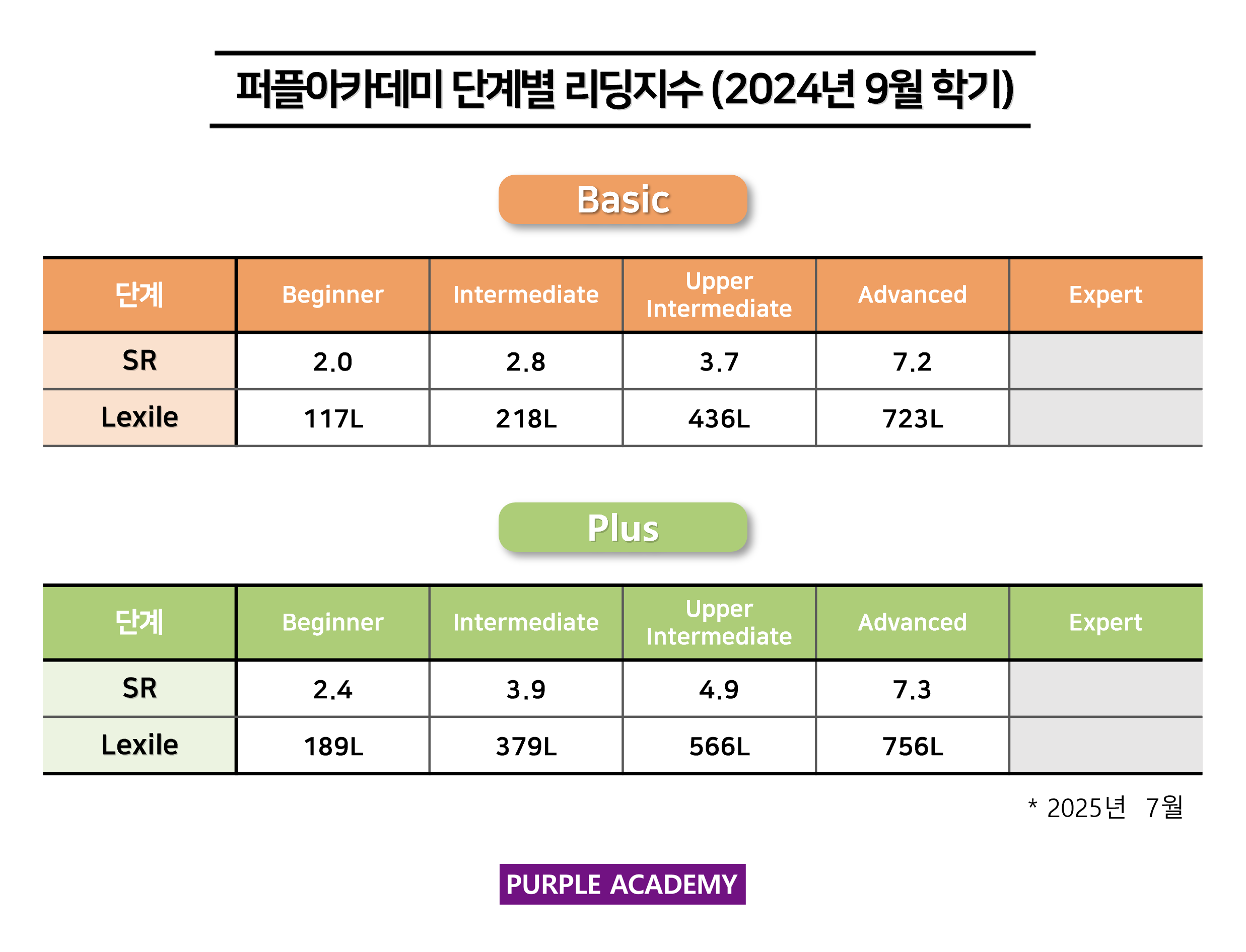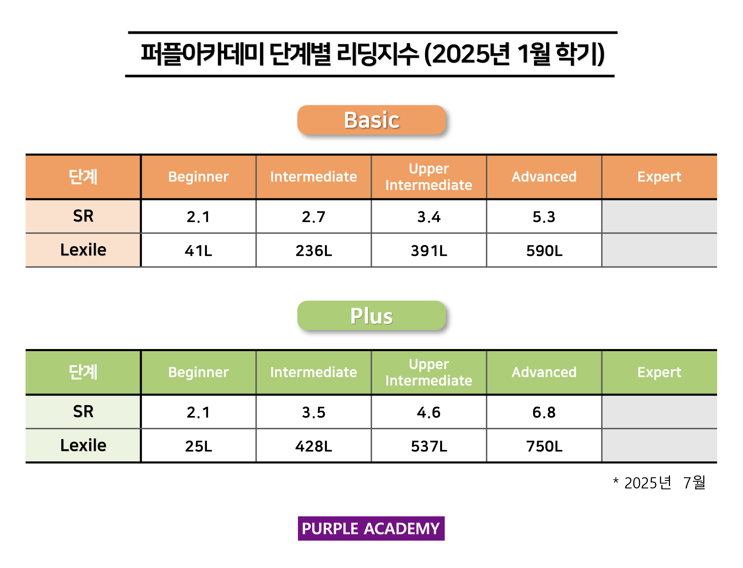 퍼플 Kids의 학기별, 단계별 2025년 7월 리딩 지수를 공개합니다!