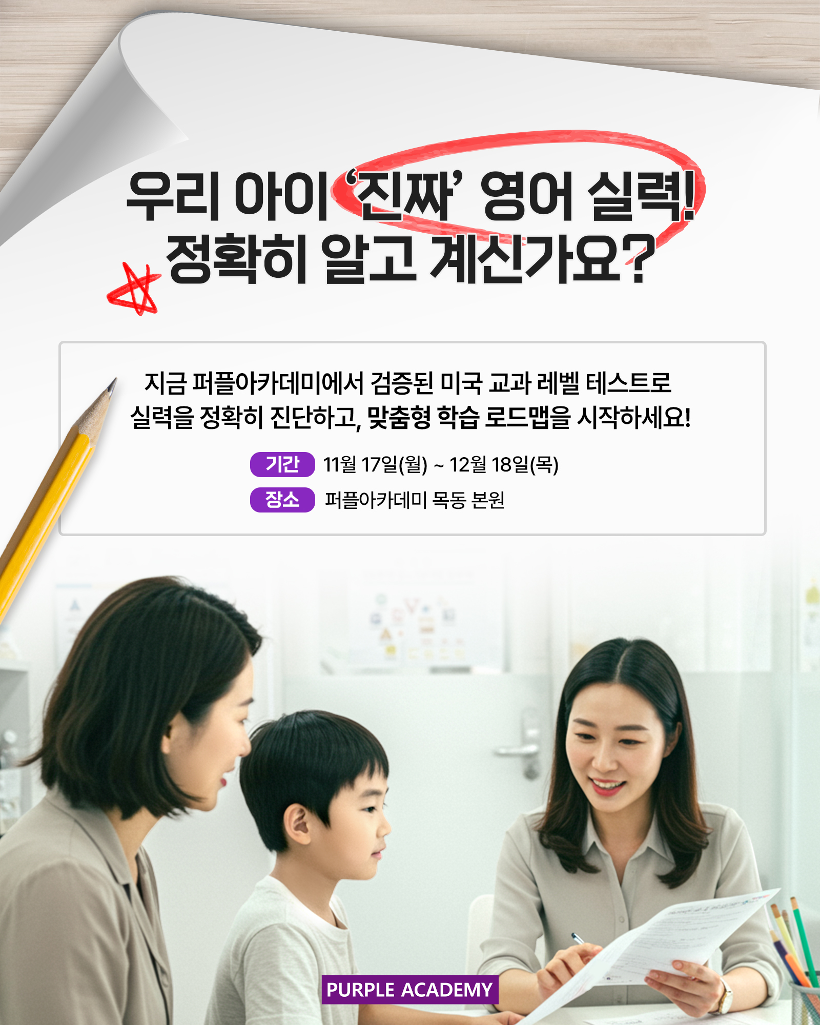 퍼플아카데미의 검증된 미국 교과 레벨 테스트로 정확한 진단 받고,채워야 할 부족한 영역의 학습 상담까지 원데이로 받아가세요!