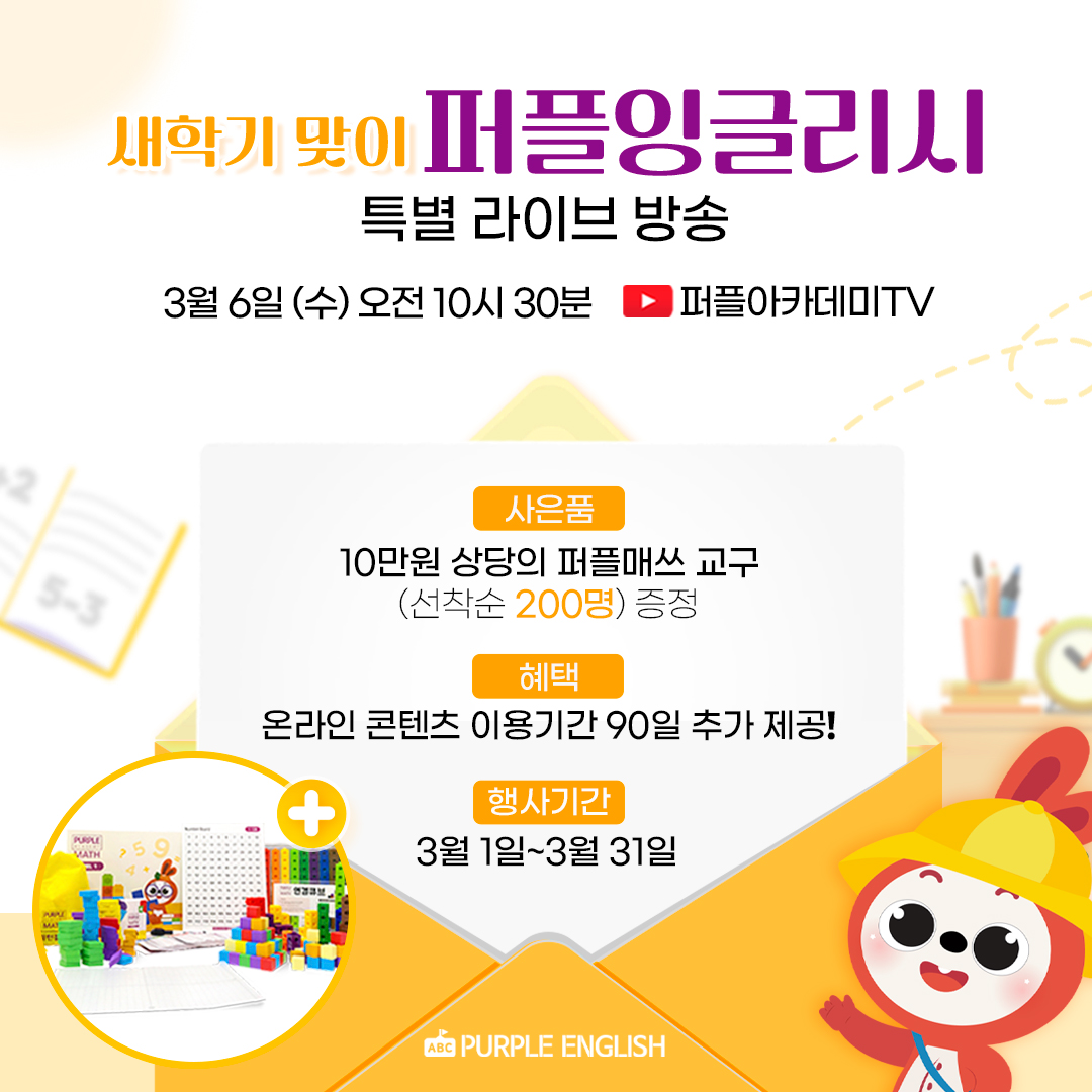 새학기 특별 혜택도 받고, 퍼플잉글리시와 함께 우리 아이 영어 첫 걸음을 완벽하게 만들어 보세요!