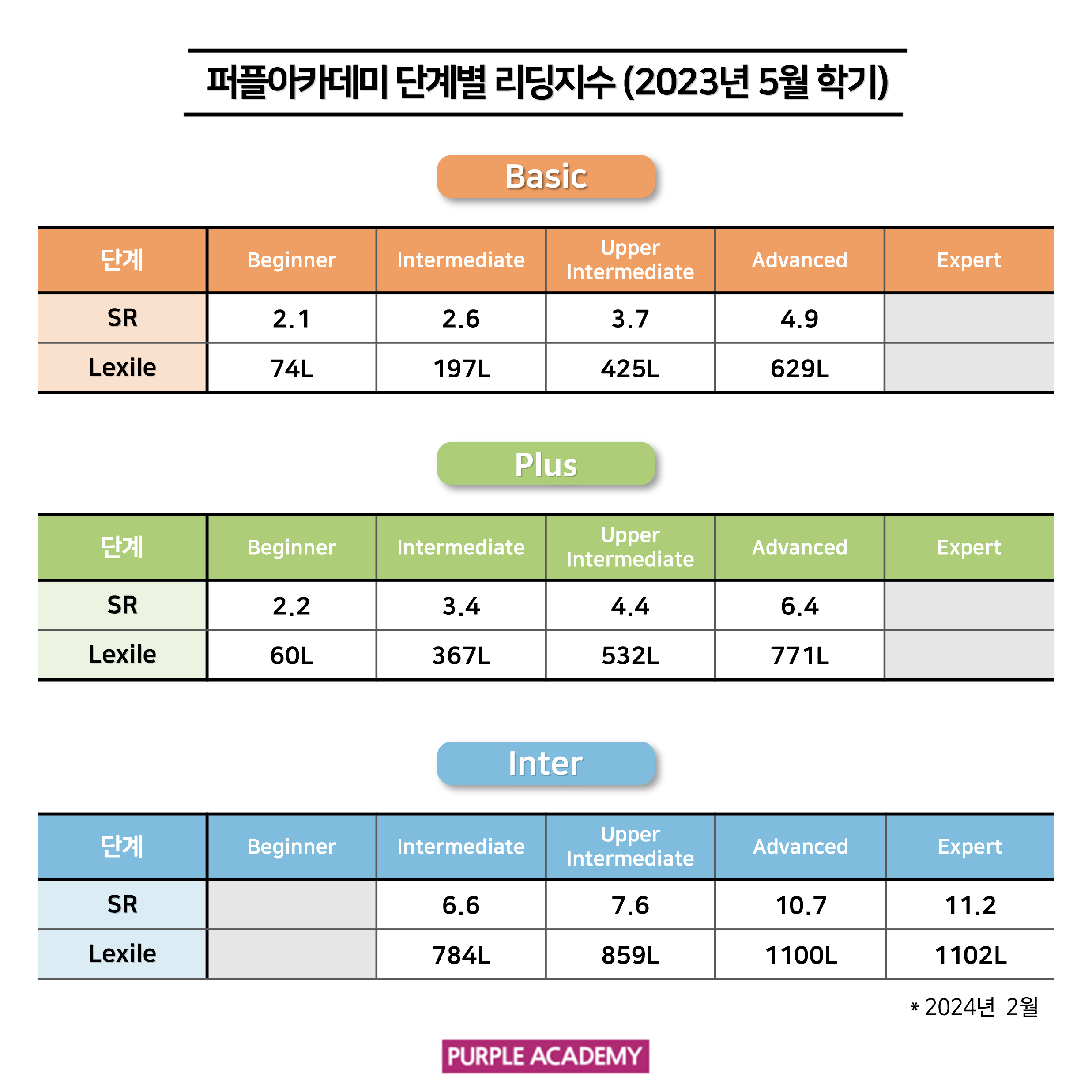 퍼플 Kids의 학기별, 단계별 2024년 2월 리딩 지수를 공개합니다!