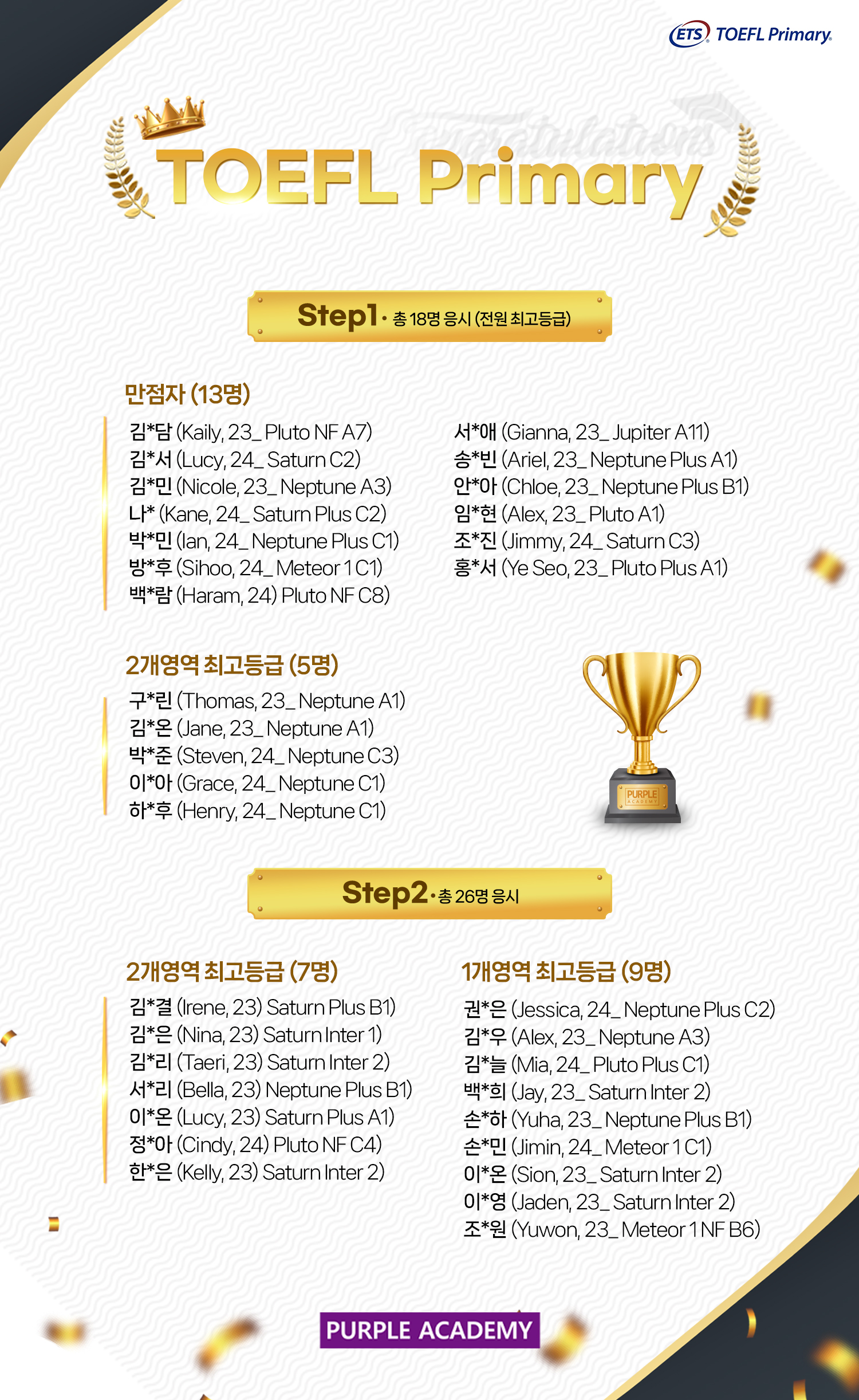 TOEFL Junior 총 78명 응시, TOEFL Primary Step 1에 18명, Step 2에 26명이 응시하였습니다.