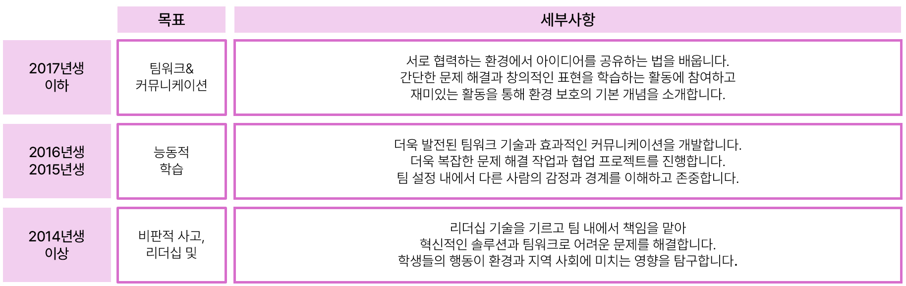 - 미래 설계 및 인성 교육: 미래의 글로벌 인재로 성장할 수 있도록 다양한 활동과 교육 프로그램을 통해 인성과 리더십을 함양