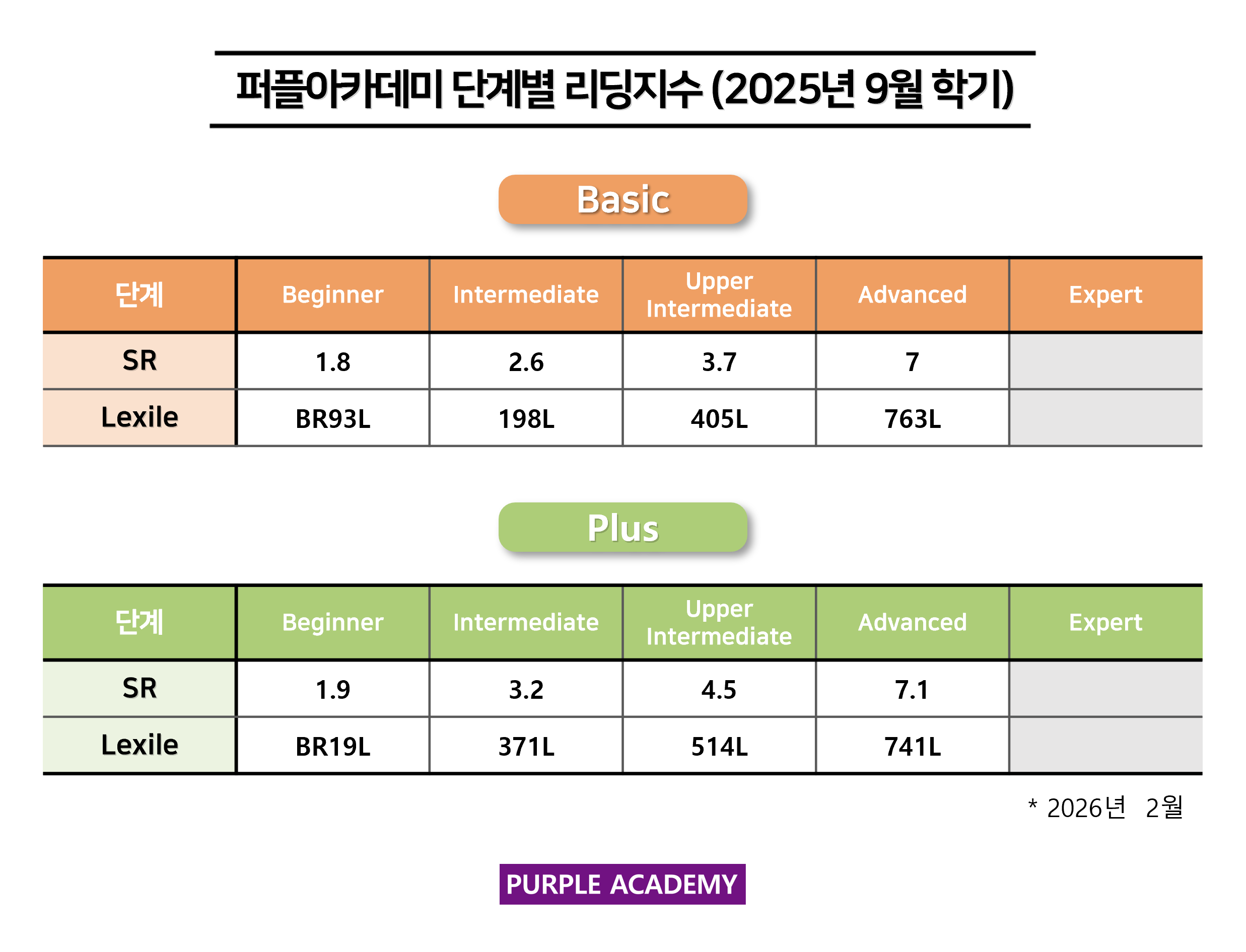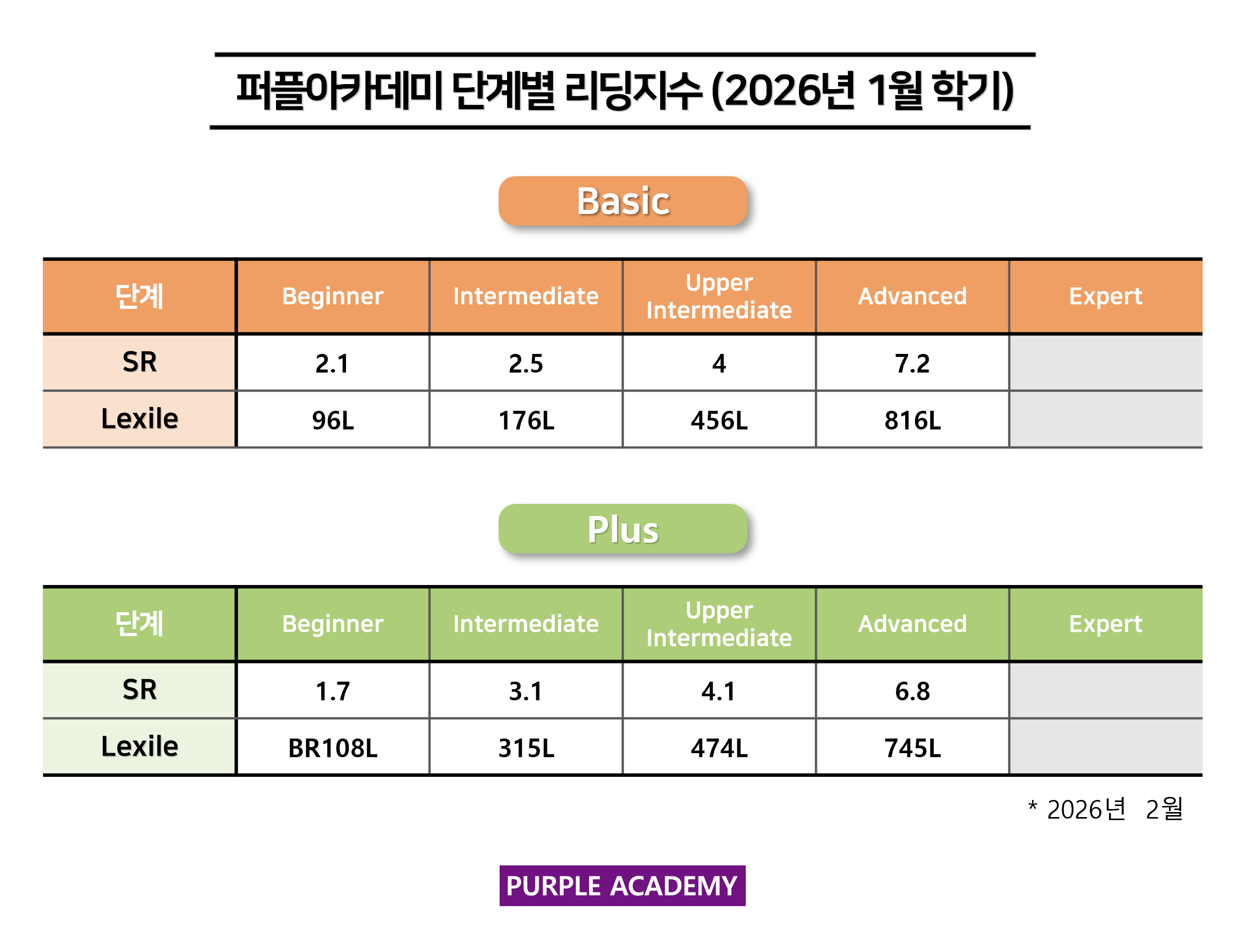 퍼플 Kids의 학기별, 단계별 2026년 2월 리딩 지수를 공개합니다!